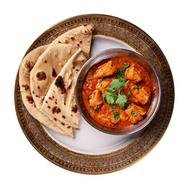 Server med friskkogte basmatiris eller naanbrød og pynt med frisk koriander.